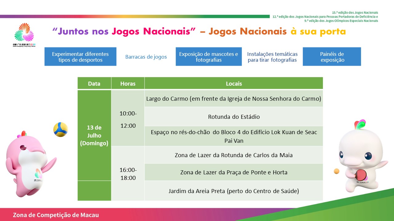 Para que os cidadãos possam sentir de perto a atmosfera vibrante dos Jogos Nacionais, preparando a chegada da 15.ª edição dos Jogos Nacionais e a 12.ª edição dos Jogos Nacionais para Pessoas Portadoras de Deficiência e 9.ª edição dos Jogos Olímpicos Especiais Nacionais (adiante designada por 15.ª edição dos Jogos Nacionais e Jogos Olímpicos Especiais para Deficientes), a realizar em Novembro e Dezembro, o Gabinete Preparatório para a Organização da Zona de Competição de Macau da 15.ª edição dos Jogos Nacionais e Jogos Olímpicos Especiais para Deficientes (adiante designado por Gabinete Preparatório) voltará a realizar neste domingo , dia 13 de Julho, a actividade “Jogos Nacionais à sua porta”, a fim de aprofundar os conhecimentos dos cidadãos sobre o Jogos Nacionais através de uma forma interactiva, descontraída e interessante, fazendo o “aquecimento” para a chegada do grande evento desportivo.