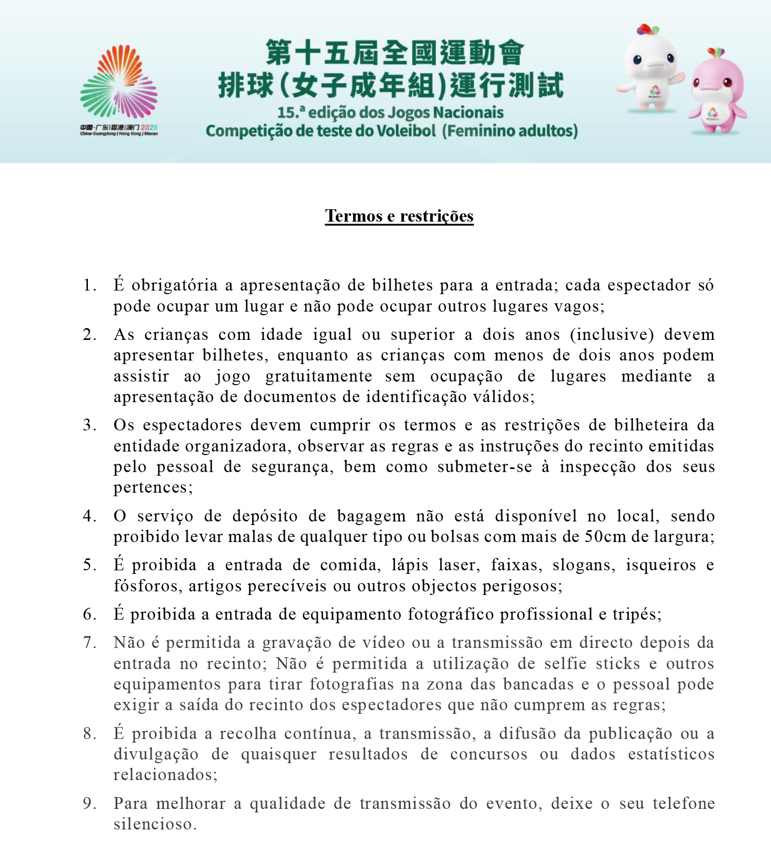 As competições de teste para a modalidade de voleibol (feminino adultos) da 15.ª edição dos Jogos Nacionais da zona de competição de Macau terão lugar nos dias 31 de Maio e 1 de Junho, na Arena da Nave Desportiva dos Jogos da Ásia Oriental de Macau. Este evento é organizado pelo Gabinete Preparatório para a Organização da Zona de Competição de Macau da 15.ª edição dos Jogos Nacionais e Jogos Olímpicos Especiais para Deficientes com a colaboração da Associação Geral de Voleibol de Macau-China, contando com a participação de quatro equipas de voleibol, incluindo as equipas de Macau A, de Macau B, da Júnior da Província de Guangdong e da Universidade Normal de Hunan.