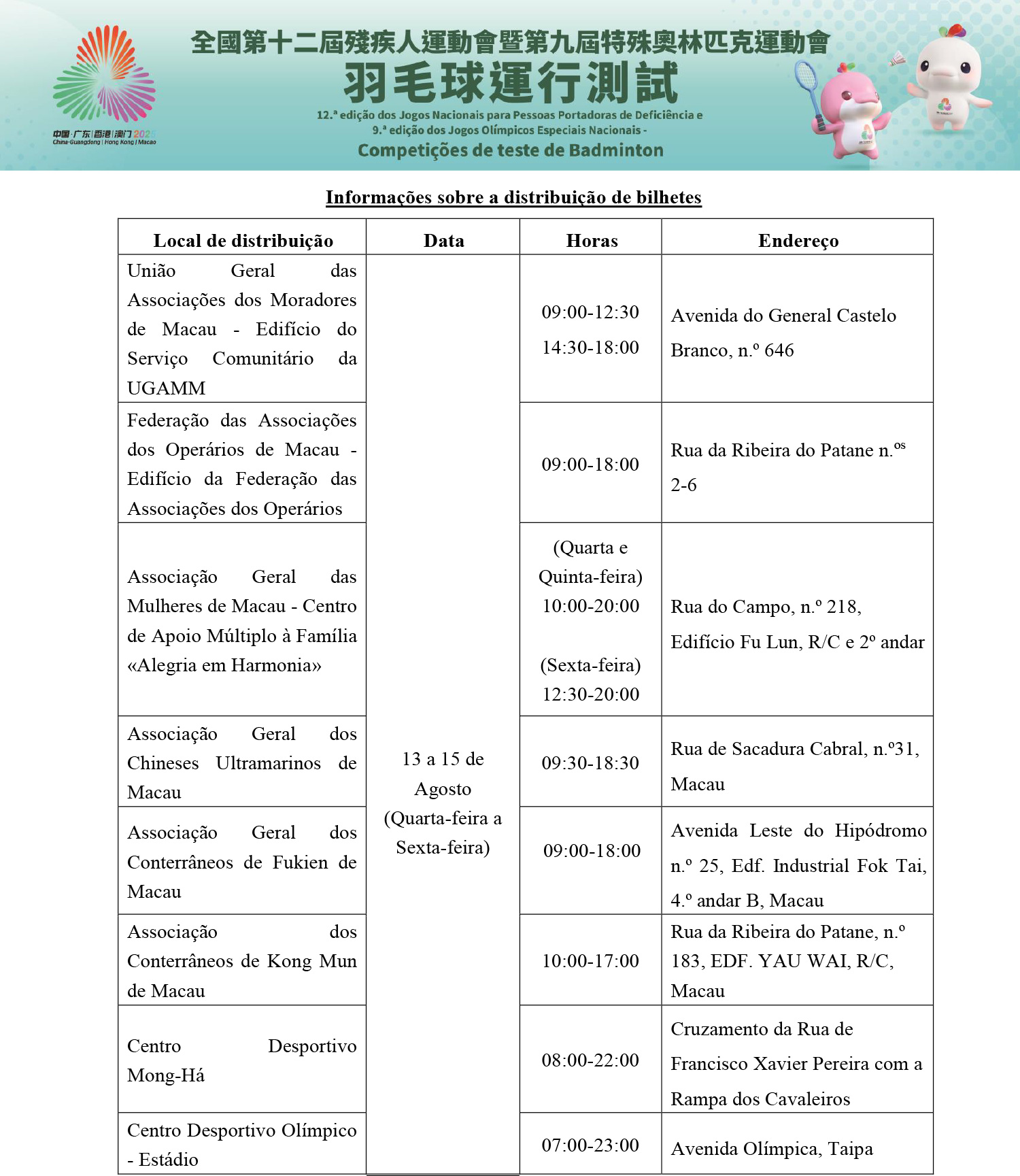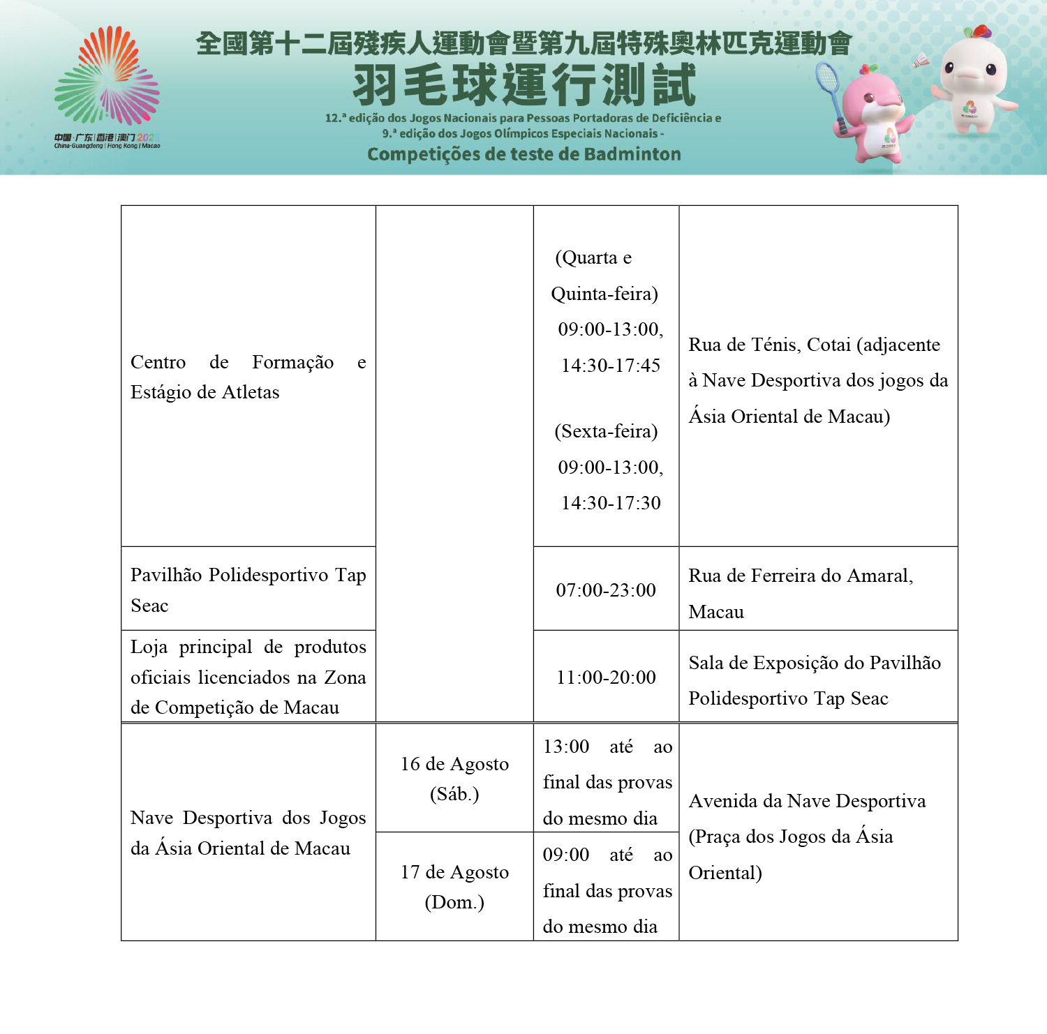 As competições de teste das modalidades de badminton da 12.ª edição dos Jogos Nacionais para Pessoas Portadoras de Deficiência e 9.ª edição dos Jogos Olímpicos Especiais Nacionais realizar-se-ão no dia 16 de Agosto, na Arena da Nave Desportiva dos Jogos da Ásia Oriental de Macau. O evento é realizado pelo Gabinete Preparatório para a Organização da Zona de Competição de Macau da 15.ª edição dos Jogos Nacionais e Jogos Olímpicos Especiais para Deficientes, colaborado pelo a Macau Special Olympics e Federação de Badminton de Macau. A competição vai contar com singulares masculinos e femininos, num total de 27 atletas de Macau.