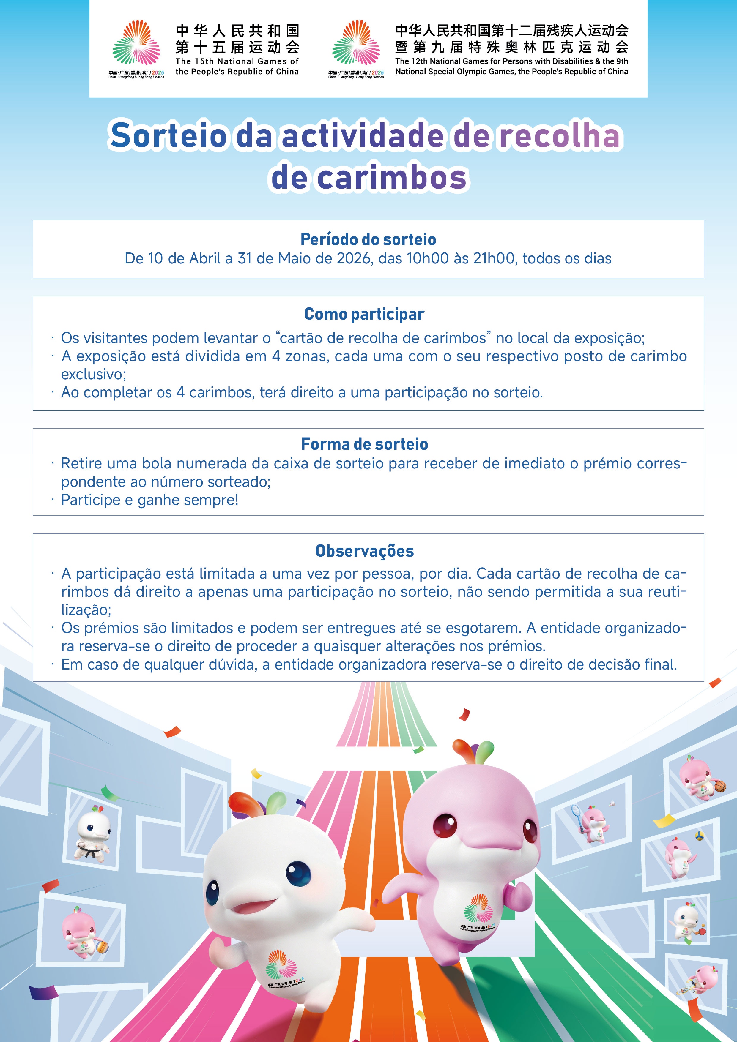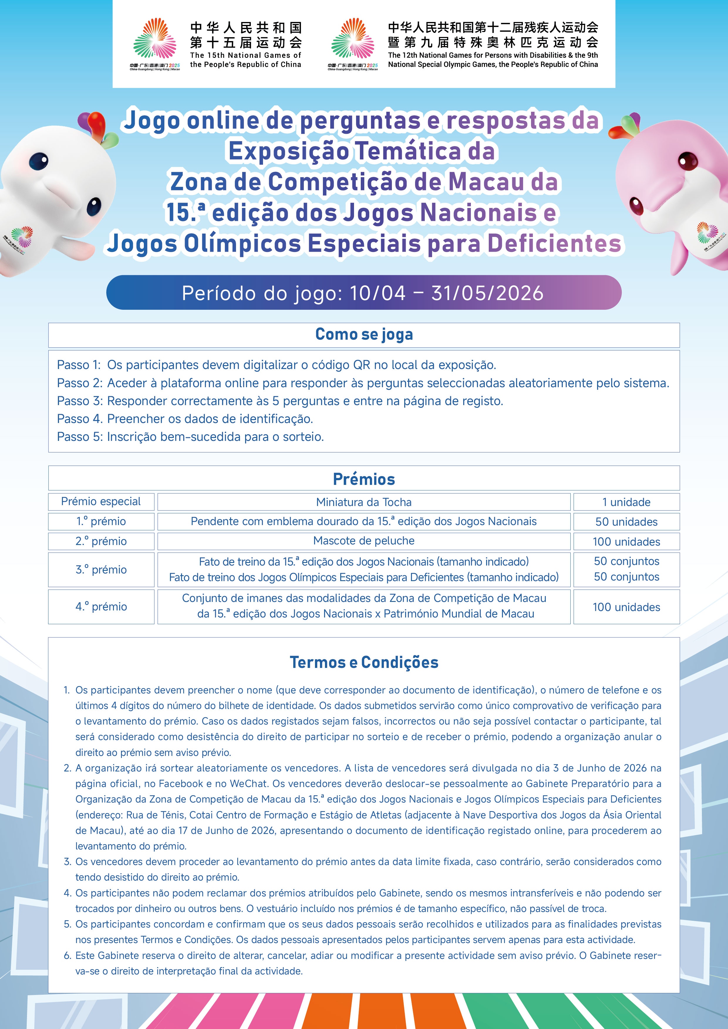 Para mais informações, queira consultar a página electrónica da Zona de Competição de Macau: www.2025nationalgames.gov.mo, a página do Facebook “第十五屆全運會澳門賽區” (Zona de Competição de Macau da 15.a edição dos Jogos Nacionais) e a conta oficial do WeChat “全運會殘特奧澳門賽區” (Zona de Competição de Macau dos Jogos Olímpicos Especiais para Deficientes).