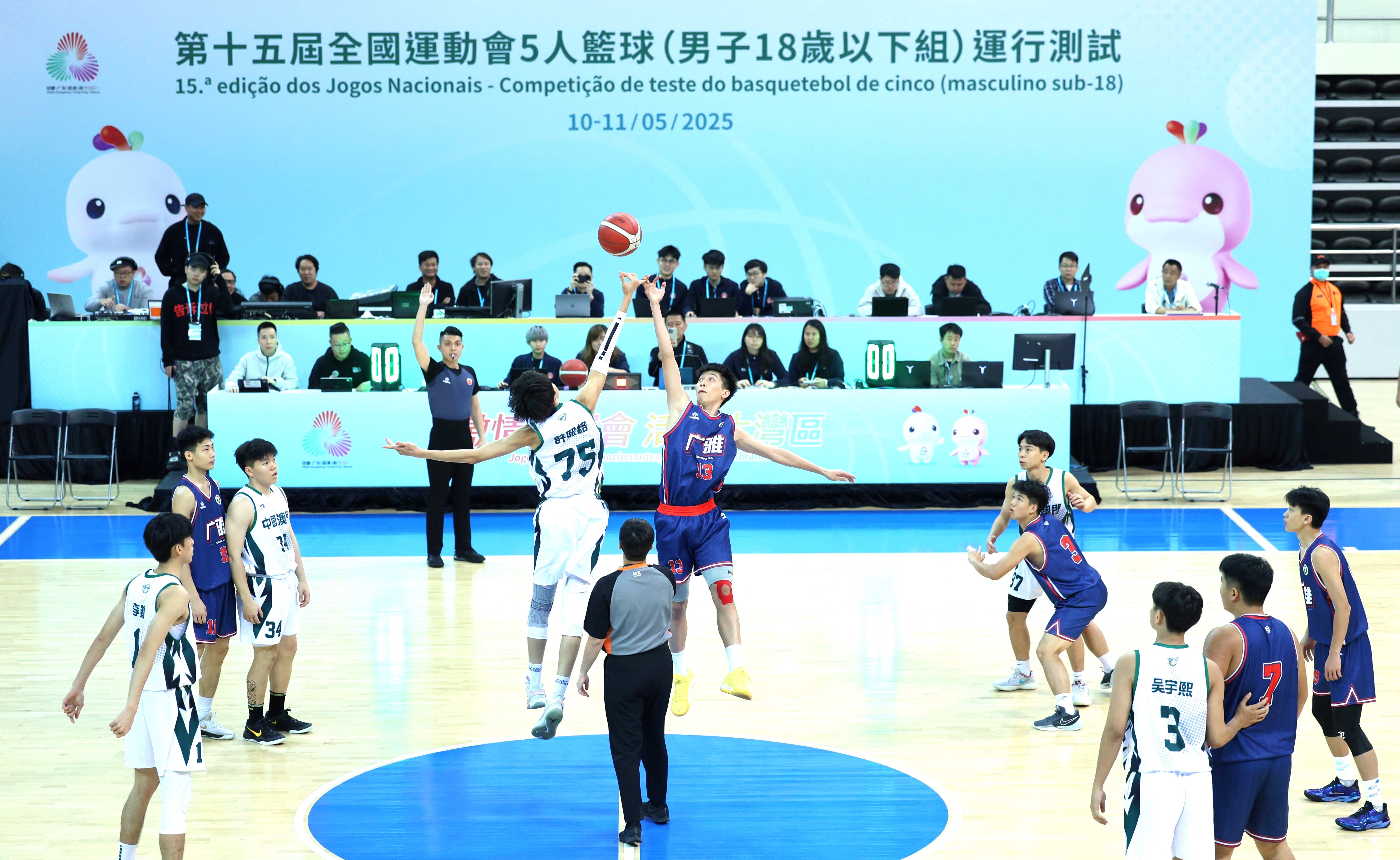 由粤港澳三地首次联合举行的第十五届全国运动会及全国第十二届残疾人运动会暨第九届特殊奥林匹克运动会将于本年11、12月揭幕,为确保正式赛事顺利举行,由十五运会及残特奥会澳门赛区筹备办公室统筹,联同组委会各政府部门及中国澳门篮球总会共同参与,并邀请国家体育总局相关项目技术代表来澳指导及支援的5人篮球(男子18岁以下组)项目运行测试,于5月10日至11日在塔石体育馆A馆进行,整体测试达至预期目标。