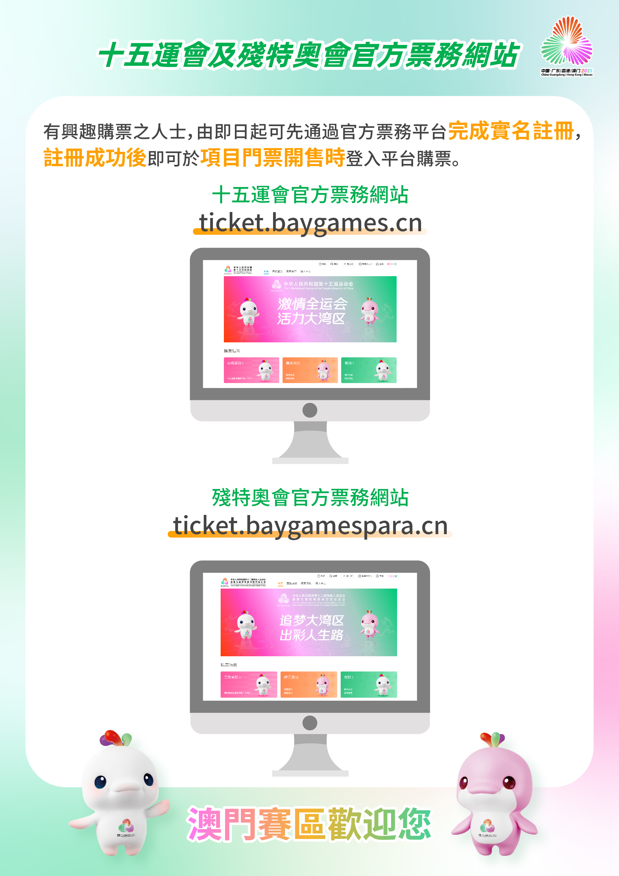 第十五届全国运动会及全国第十二届残疾人运动会暨第九届特殊奥林匹克运动会(下称“十五运会和残特奥会”)将于本年11月、12月在粤港澳三地举行。澳门将会承办十五运会的乒乓球、3人篮球、5人篮球(男子18岁以下组)、排球(女子成年组)及空手道5个项目,以及残特奥会2个羽毛球项目。各赛区的项目赛事门票将根据竞赛安排分阶段、分批次销售。有兴趣购票之人士,必须通过官方票务平台完成实名注册,注册成功后再于项目门票开售时登入平台购票。