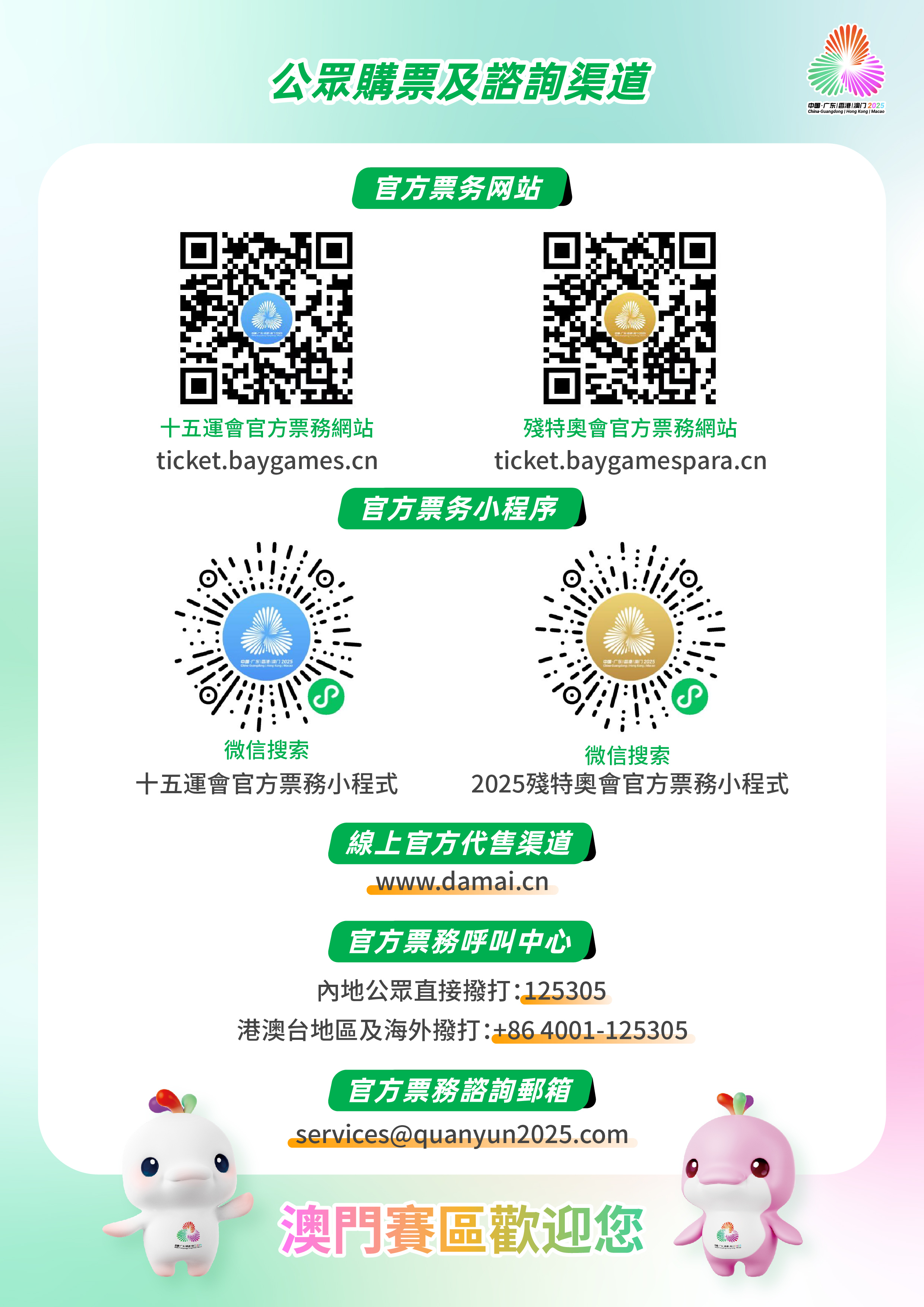 为更好地服务购票公众,十五运会和残特奥会组委会设立票务呼叫中心,内地公众可直接拨打125305,港澳台地区及海外可拨打+86 4001-125305,或电邮至services@quanyun2025.com查询。