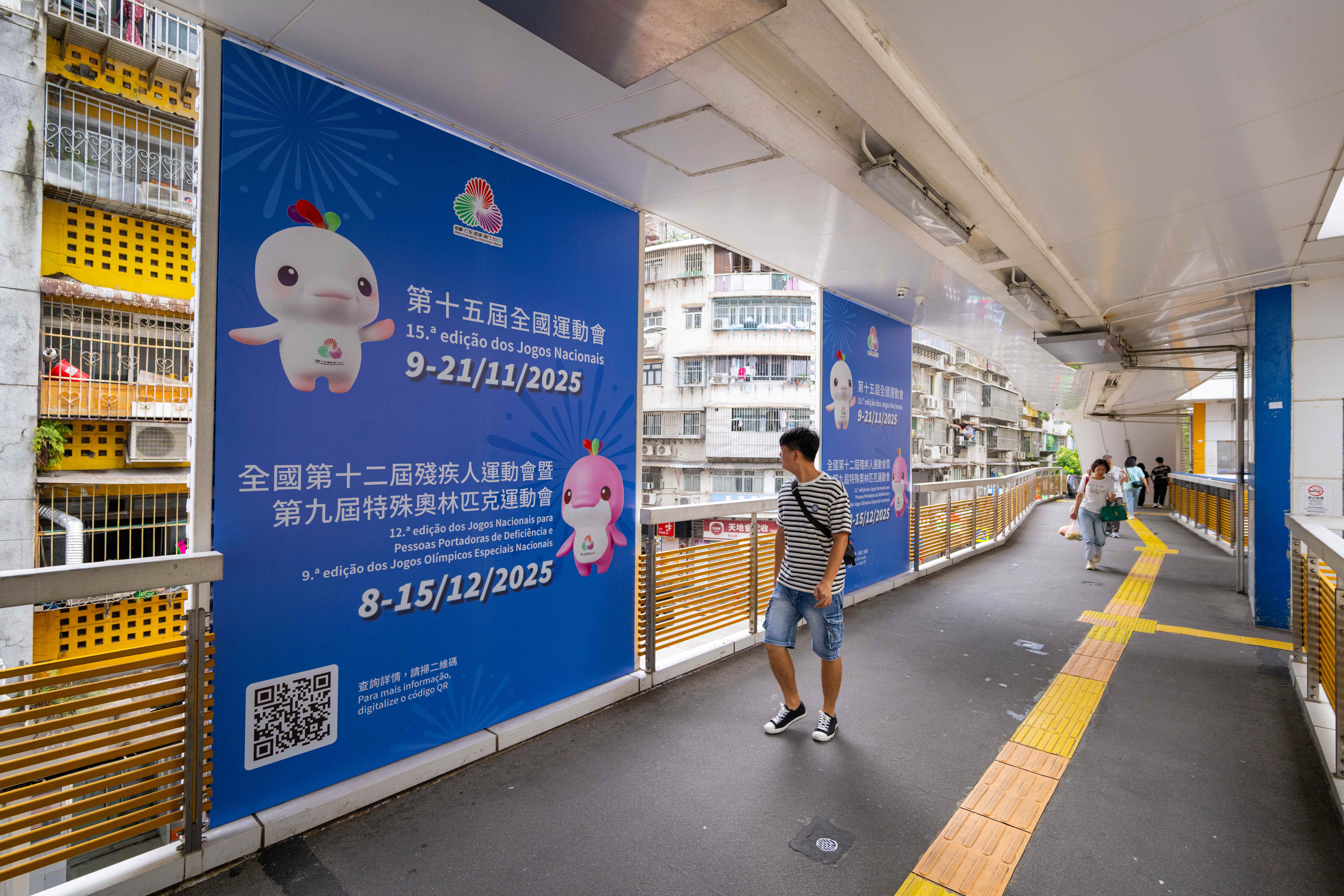 此外,澳门多条行人天桥及主要道路的灯柱旗帜已换上十五运会和残特奥会主题横额,多辆巴士亦换上吉祥物彩绘设计,成为城市流动宣传平台,让市民和旅客感受到运动会的活力与盛事气氛。