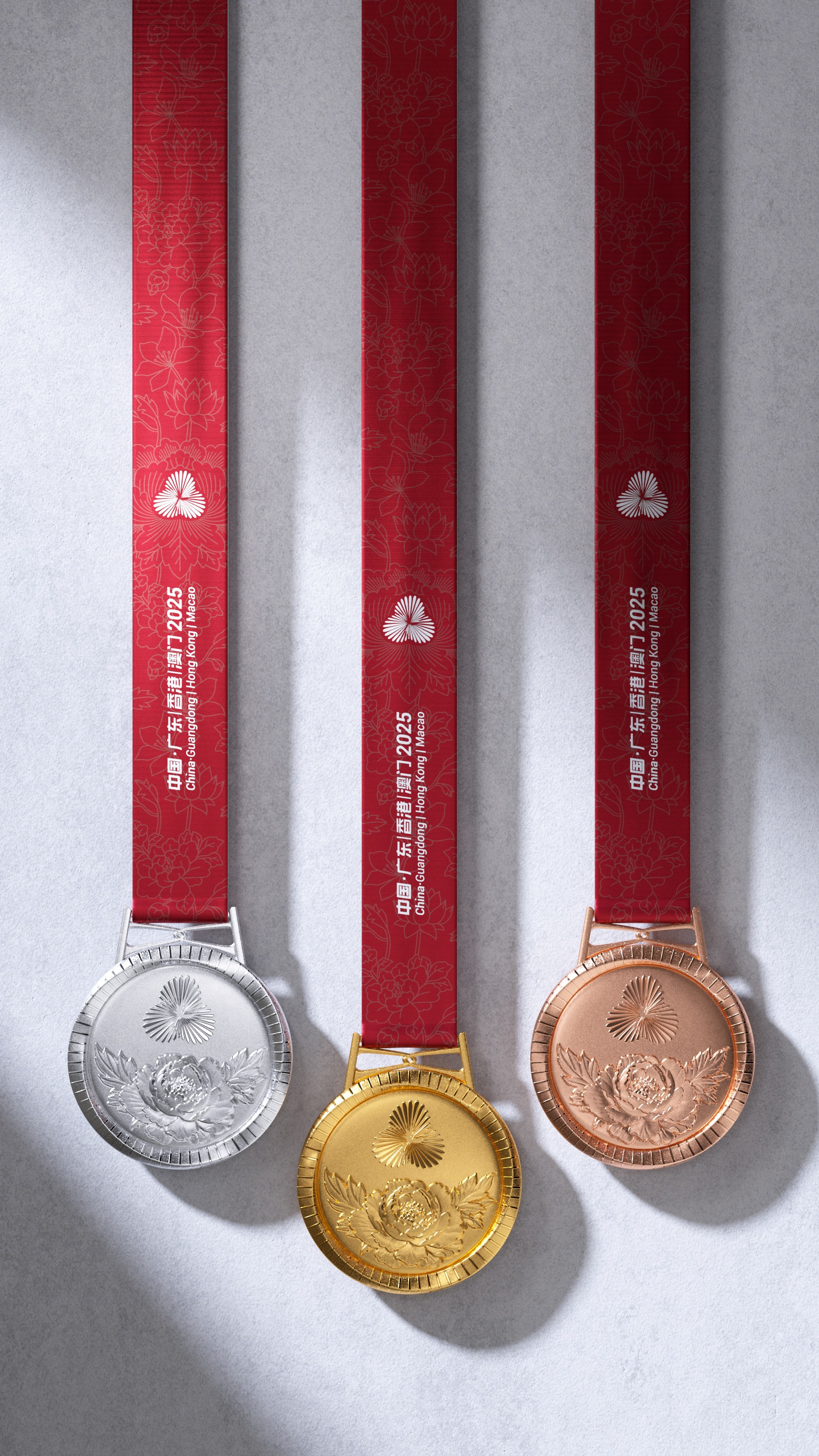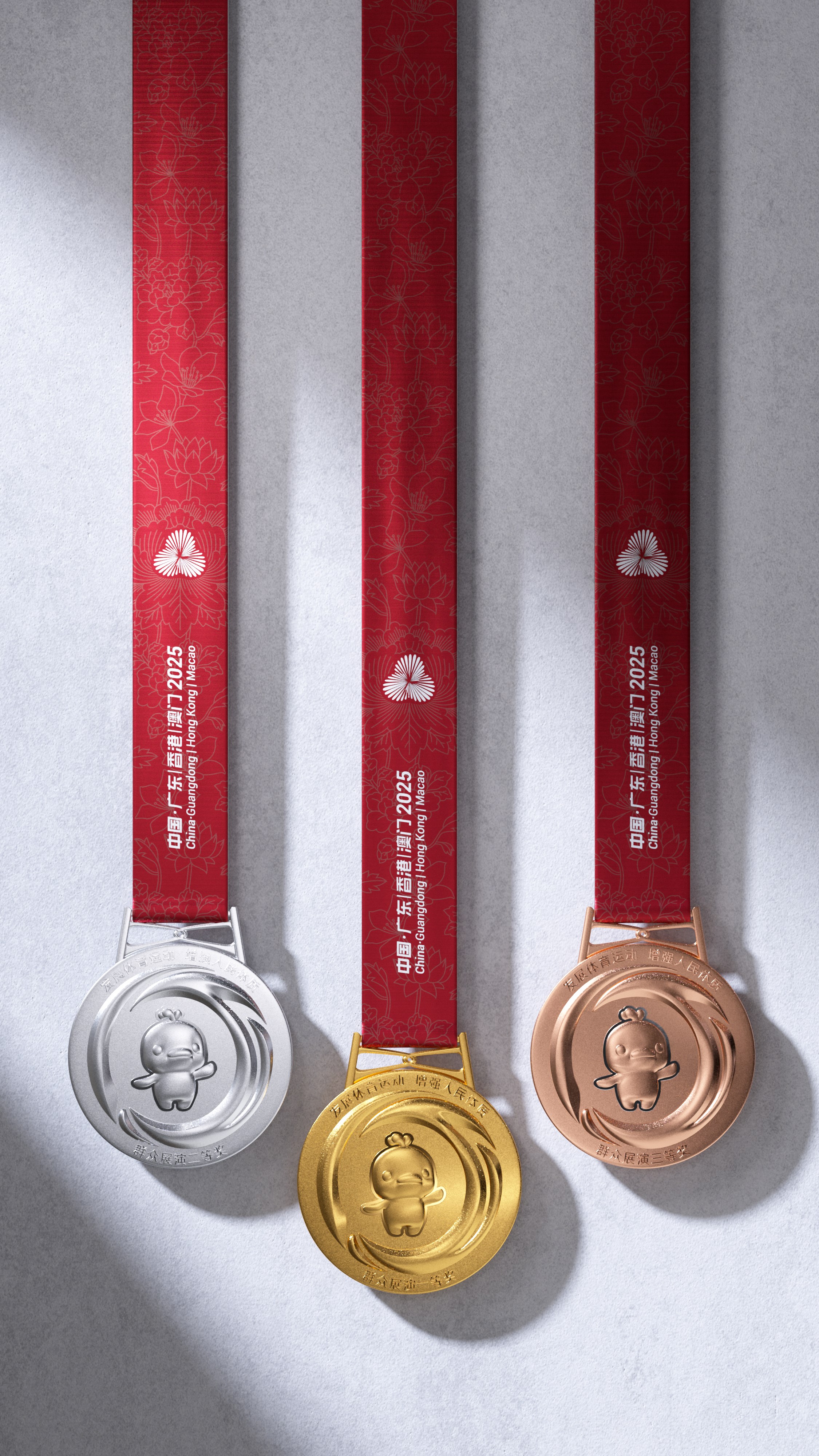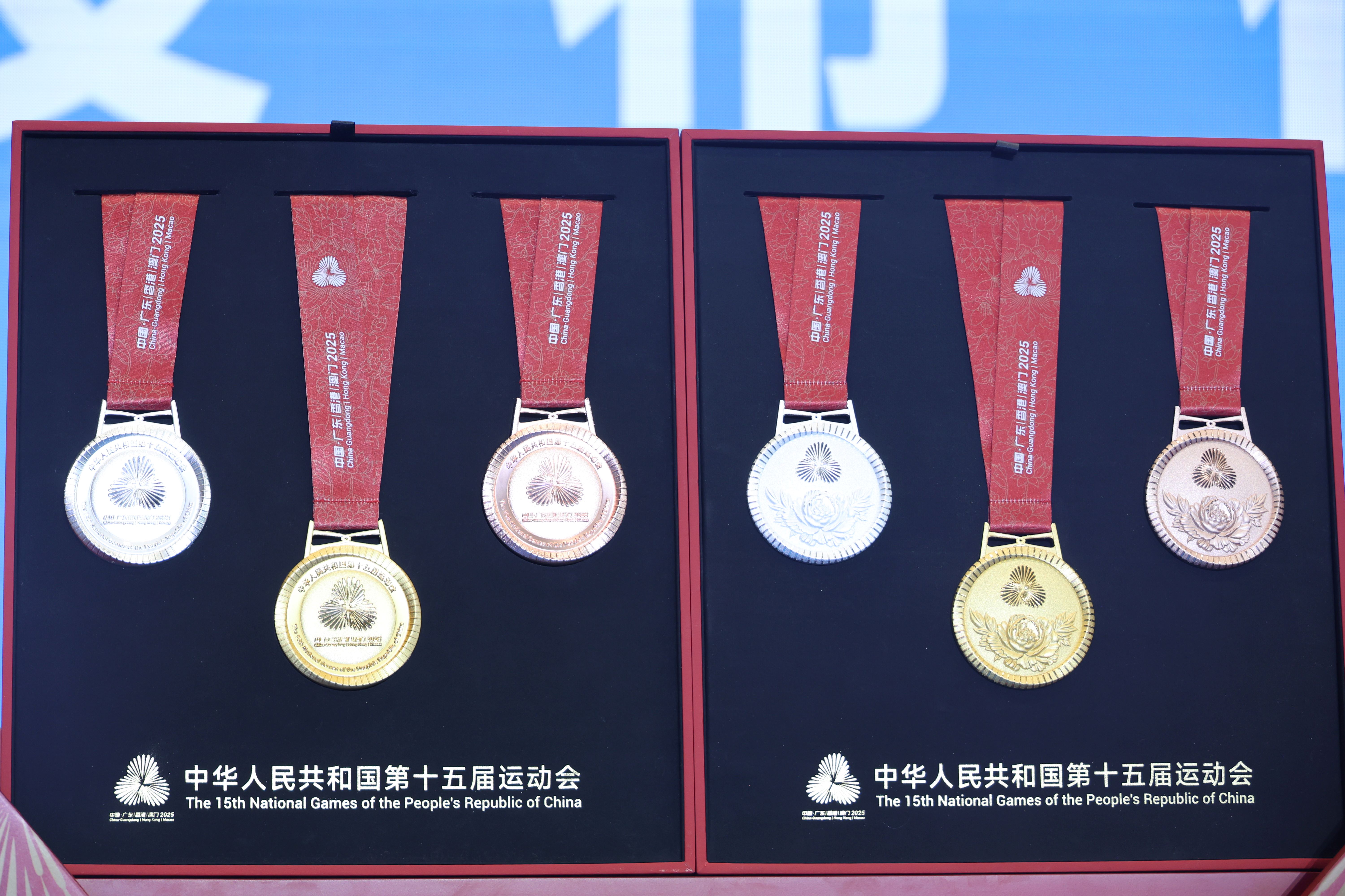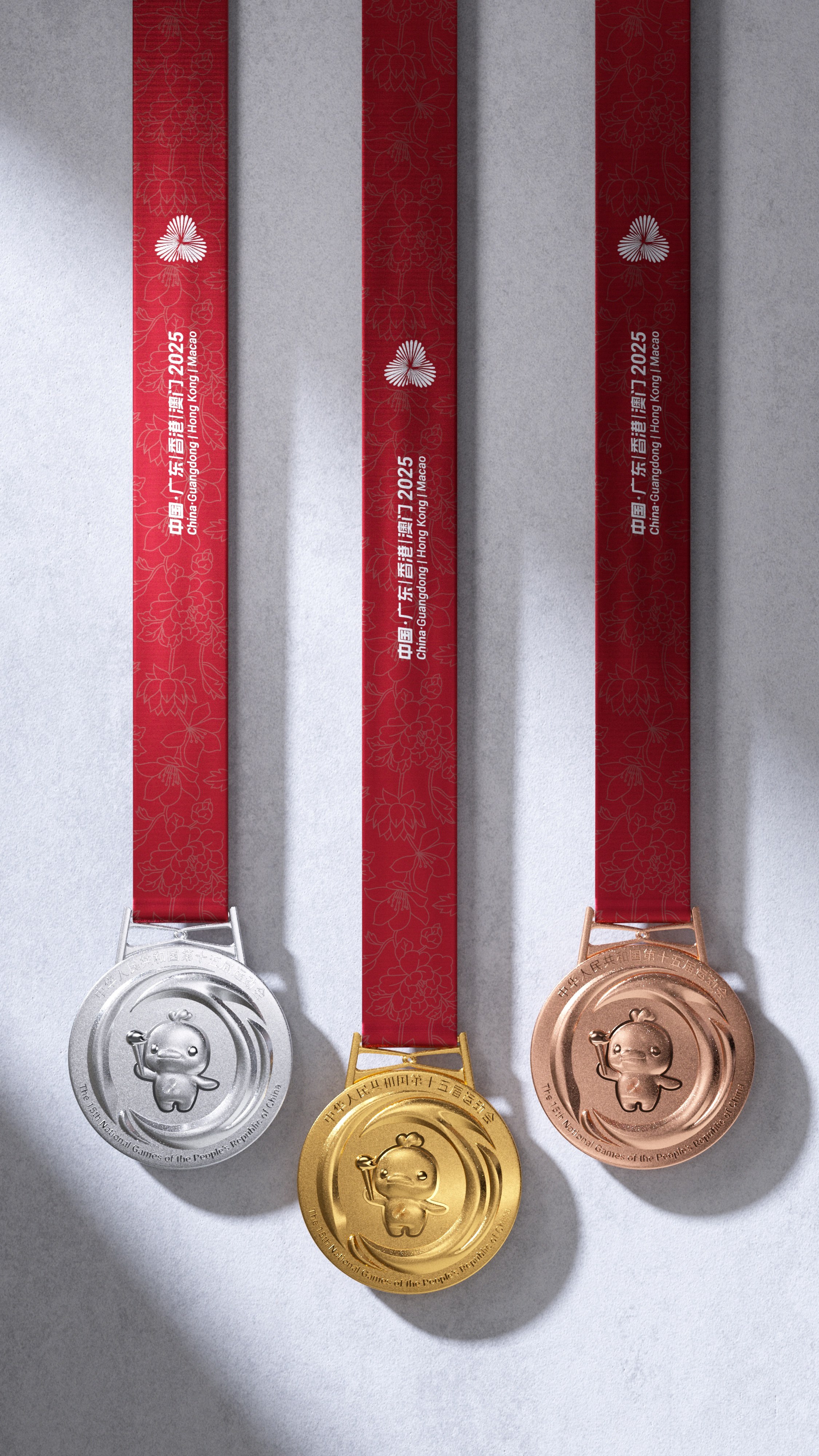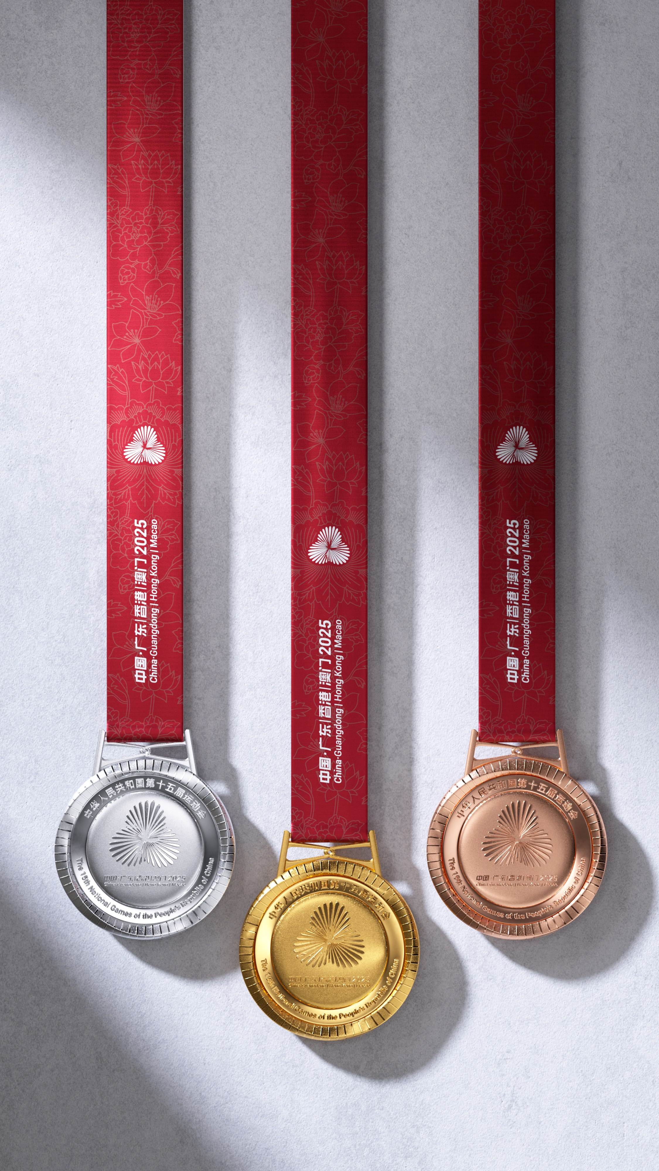 “同心躍”奬牌設計融合粵港澳大灣區發展脈搏、中華文化底蘊與全運歷史傳承。競技體育項目奬牌重354.5克,一面正中上方的會徽由代表粵港澳三地的花瓣交疊扭轉形成同心禮花,下方牡丹花托舉而上,寓意粵港澳大灣區背靠祖國繁榮發展,為民族復興貢獻力量。中間的吉祥物中華白海豚手舉火炬,靈動活潑,周圍浪濤造型的數字“15”巧妙地將全運會屆別與體育精神的傳承完美結合。群眾賽事活動奬牌重232克,一面刻有會徽和運動會名稱,另一面則是吉祥物中華白海豚浮雕及毛澤東同志的題詞“發展體育運動 增強人民體質”,充分彰顯“全民全運,全運惠民”的理念。奬牌邊緣雕刻的66道紋路,象徵著全運會66年的輝煌歷史,掛扣採用港珠澳大橋同心結造型,寓意三地團結一心,奬牌綬帶以“三花映牡丹”為紋樣,突顯粵港澳大灣區的獨特風采。而配套的獲奬證書、牌匾及信封等均延續“三花映牡丹”的視覺體系。