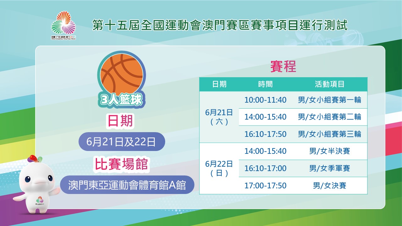 是次3人籃球運行測試由珠海、中山、江門及澳門男、女子各4隊籃球隊作賽,以小組賽和淘汰賽進行節奏明快的3x3籃球賽事,而空手道將由本澳運動員同場競技,累積寶貴的實戰經驗。