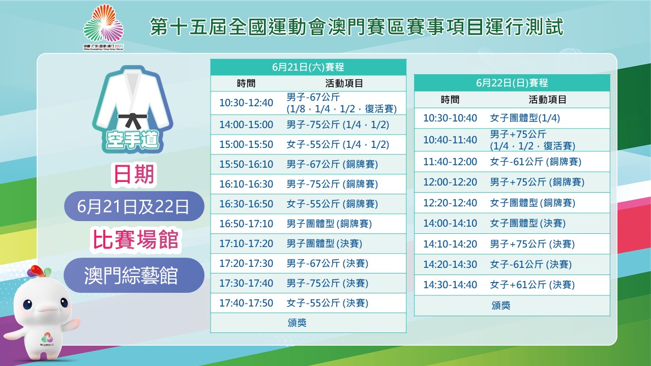 如欲參閱更多賽事資料,可瀏覽賽事官方網頁www.2025nationalgames.gov.mo。同時,歡迎關注“第十五屆全運會澳門賽區”Facebook專頁及“全運會殘特奧澳門賽區”微信公眾號。