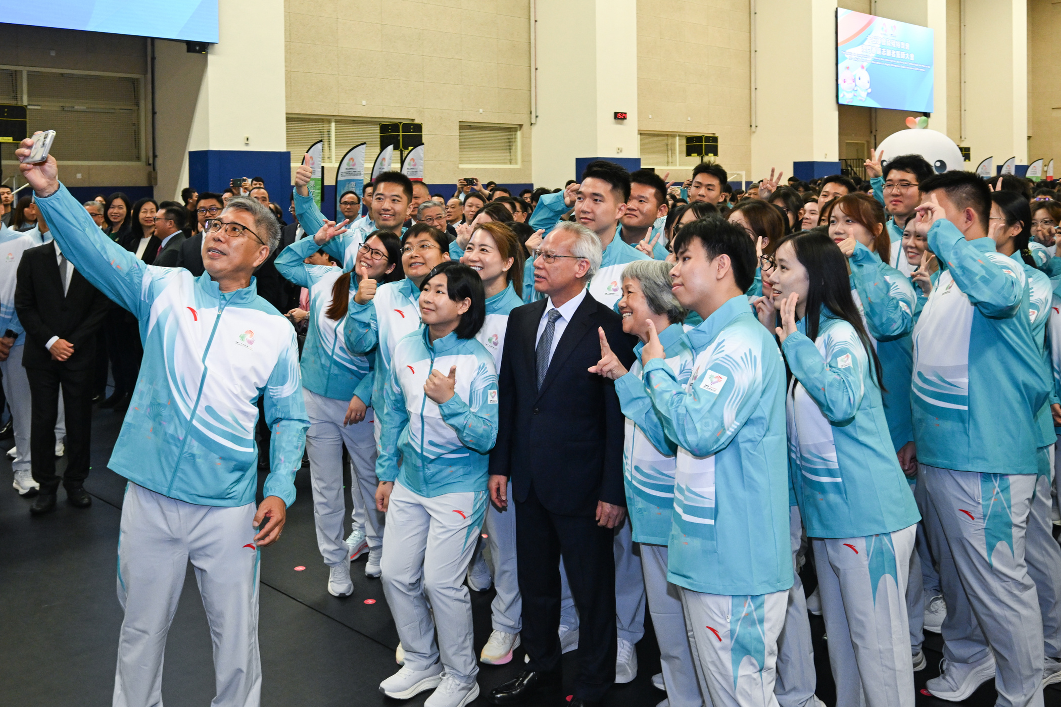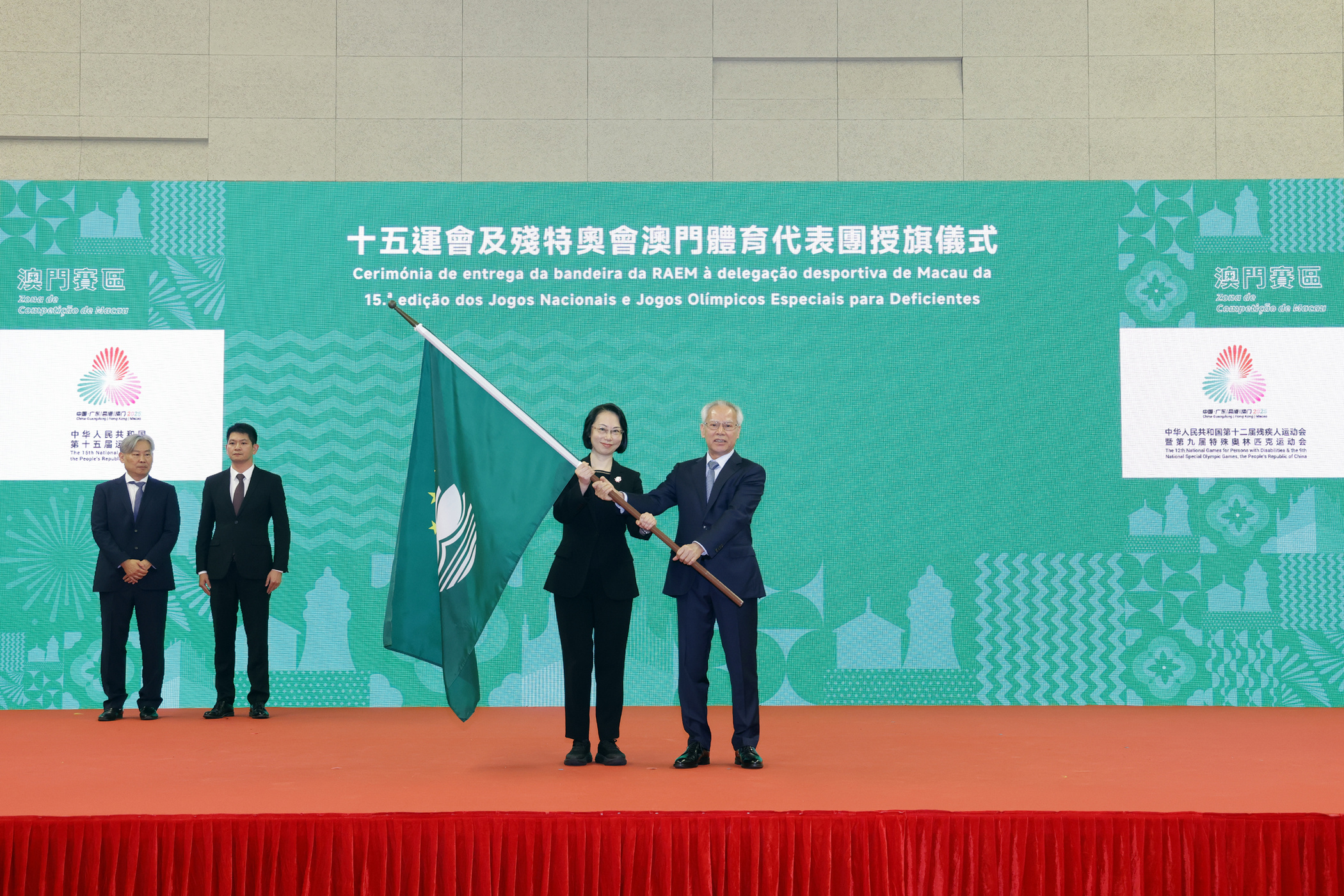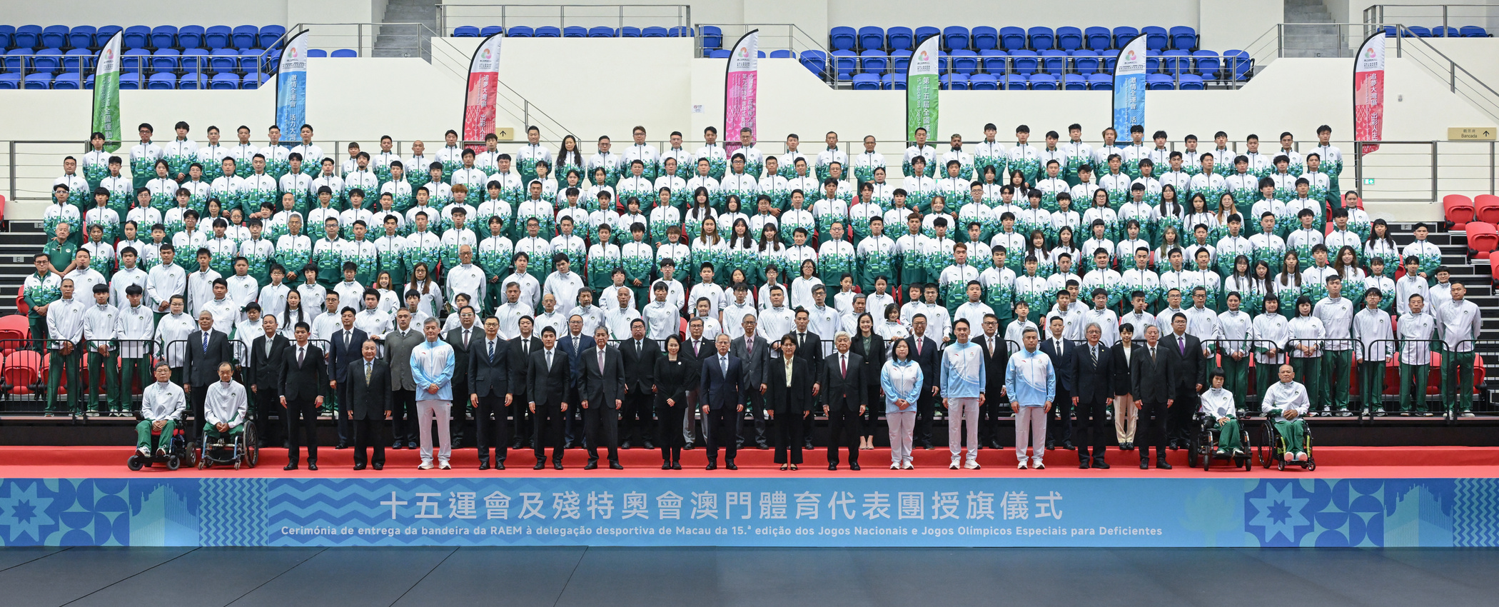 儀式在莊嚴的國歌聲和會歌《氣勢如虹》激昂旋律中拉開序幕。行政長官岑浩輝向十五運會及殘特奧會澳門體育代表團代表、社會文化司司長柯嵐授予特區區旗及勉勵體育代表團取得佳績。本澳將分別派出超過400人的體育代表團參加十五運會的23個比賽項目,包括:水上運動(游泳、藝術游泳、跳水)、田徑、羽毛球、籃球(三人籃球、五人籃球)、拳擊、單車、獨木舟(靜水)、劍擊、足球、高爾夫球、手球、柔道、射擊、乒乓球、跆拳道、網球、鐵人三項、排球(室內排球、沙灘排球)、武術、射箭、曲棍球、賽艇、帆船;亦將派出超過180人的體育代表團分別參加全國第十二屆殘疾人運動會的7個比賽項目,包括:田徑、羽毛球、硬地滾球、輪椅劍擊、鐵人三項、游泳、乒乓球;以及參加第九屆特殊奧林匹克運動會的7個比賽項目,包括:田徑、羽毛球、籃球、滾球、足球、游泳、乒乓球。