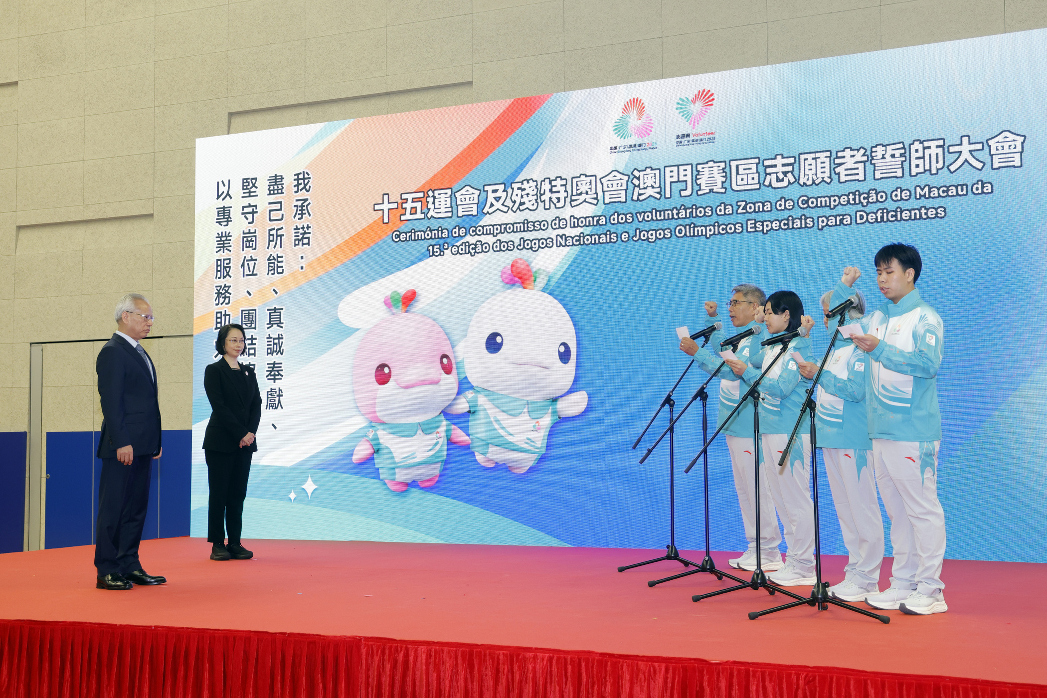 在行政長官監誓下,全場1500名志願者莊嚴宣誓,承諾盡己所能、真誠奉獻、堅守崗位、團結協作,以專業服務助力賽事,以溫暖笑容展現澳門風采,為全運澳門賽區增添光彩。活動尾聲,精彩的龍獅獻藝與歌唱表演為現場注入歡騰氣氛,授旗和宣誓儀式在喜迎盛會的熱烈氛圍中圓滿結束。