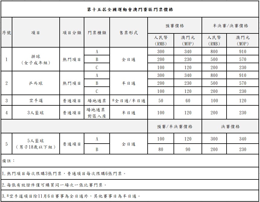 A:爲了兼顧觀賽公平與購票需求,熱門項目每場次每個訂單限購3張,普通項目每場次每個訂單限購6張。購票人必須提交真實身份資訊,同一個有效證件僅可購買同一場次1張體育比賽門票。